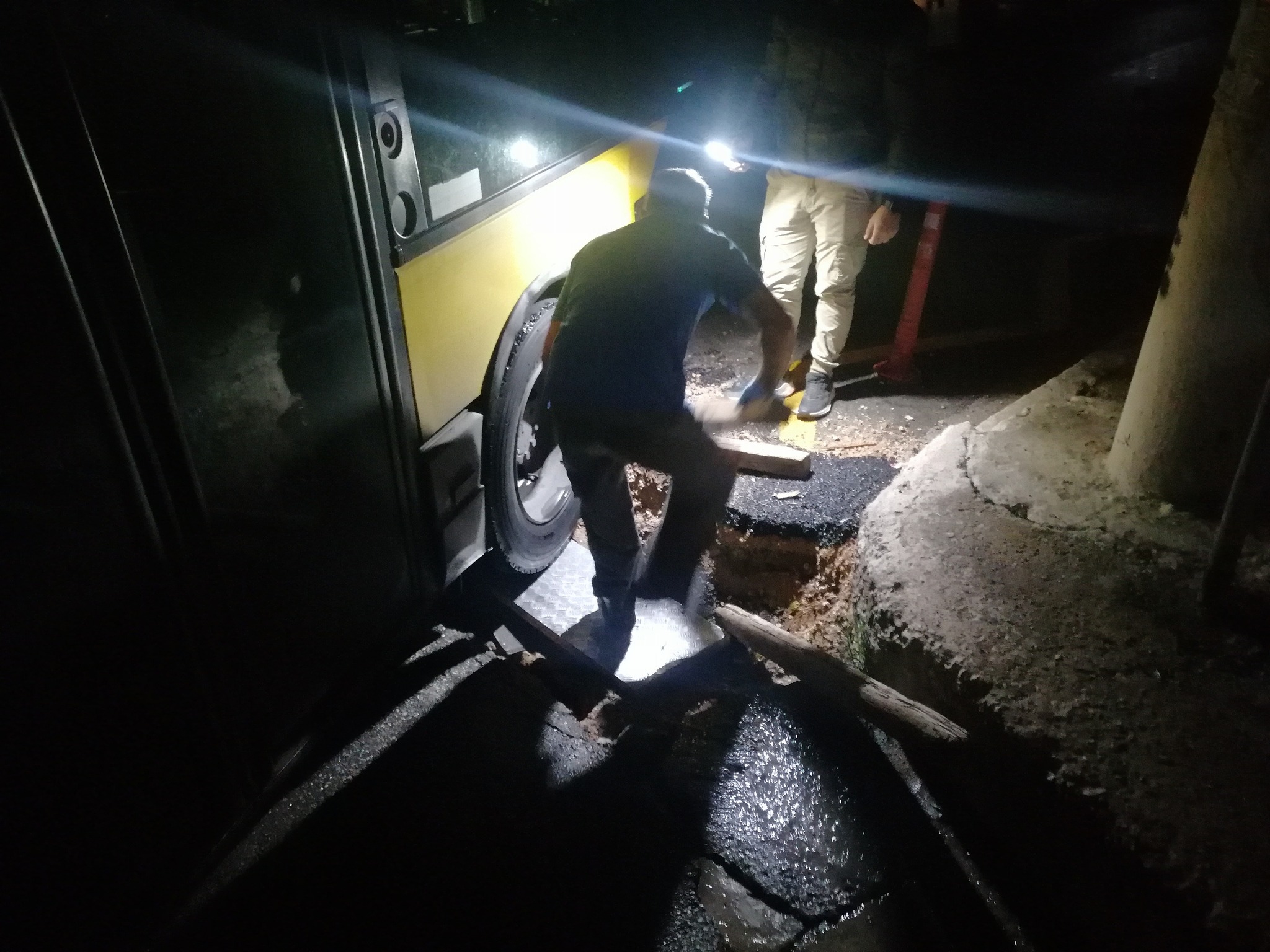 Μόνο που το βράδυ της Δευτέρας με το που έβρεξε δέκα λεπτά, έφυγε ολοσχερώς το μπάζωμα, άνοιξε μια πολύ μεγάλη τρύπα στο σημείο και το χειρότερο…το λεωφορείο της γραμμής που εκτελεί δρομολόγιο ΕΠΕΣΕ ΜΕΣΑ ΣΤΗ ΤΡΥΠΑ.