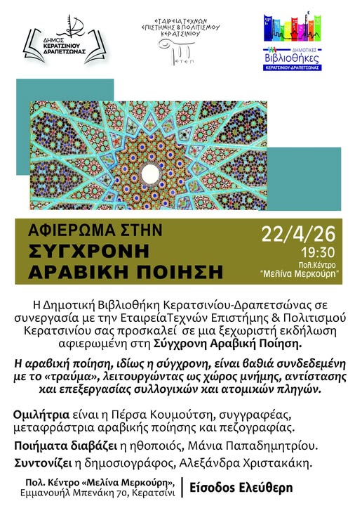 Η Δημοτική Βιβλιοθήκη Κερατσινίου-Δραπετσώνας σε συνεργασία με την Εταιρεία Τεχνών Επιστήμης & Πολιτισμού Κερατσινίου, σας προσκαλεί σε μια ξεχωριστή εκδήλωση αφιερωμένη στη Σύγχρονη Αραβική Ποίηση.