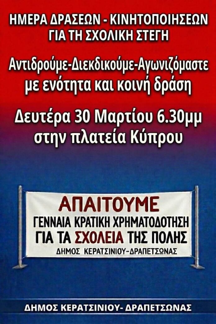 Δήμος Κερατσινίου Δραπετσώνας: ΗΜΕΡΑ ΔΡΑΣΕΩΝ – ΚΙΝΗΤΟΠΟΙΗΣΕΩΝ ΓΙΑ ΤΗ ΣΧΟΛΙΚΗ ΣΤΕΓΗ
