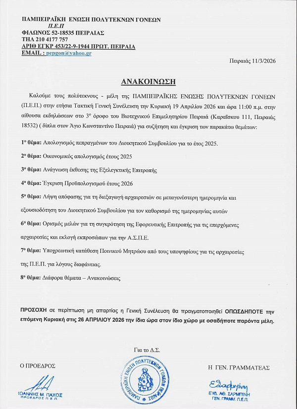 Γενικού ΕνδιαφέροντοςΚοινωνικές ΔράσειςΕτήσια Τακτική Γενική Συνέλευση την Κυριακή 19-04-2026Από Κυριάκος Θεοδωρακάκος - 12 Μαρτίου, 202612μερίδιοFacebookXPinterestWhatsApp 13