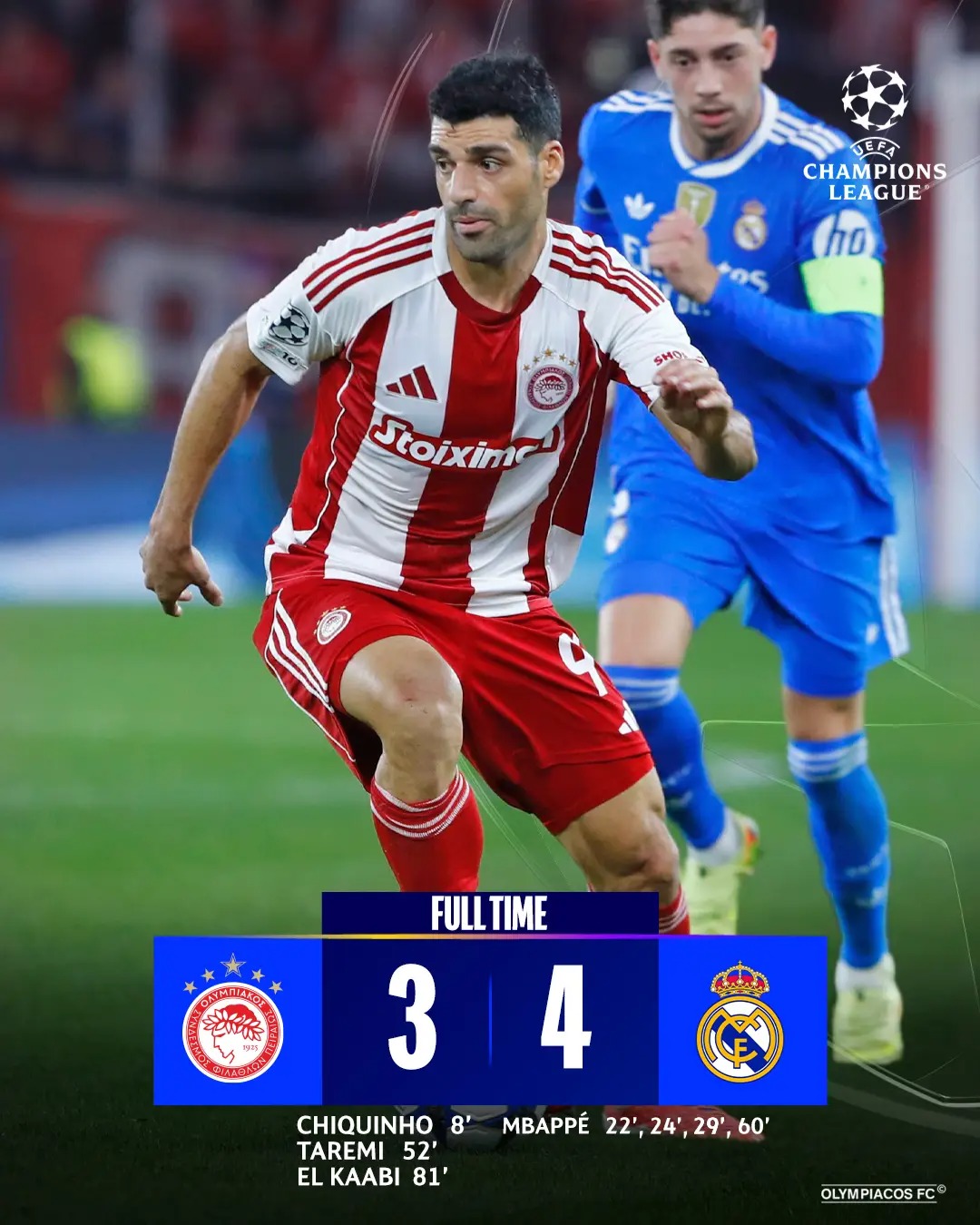 Ο Ολυμπιακός πάλεψε σαν λιοντάρι απέναντι στη Ρεάλ η οποία κάποια στιγμή φάνηκε έτοιμη να διασύρει τους Πειραιώτες οι οποίοι έβγαλαν καρδιά και ψυχή, μείωσαν σε 3-4 και έχασαν μεγάλη ευκαιρία για την απόλυτη ανατροπή.