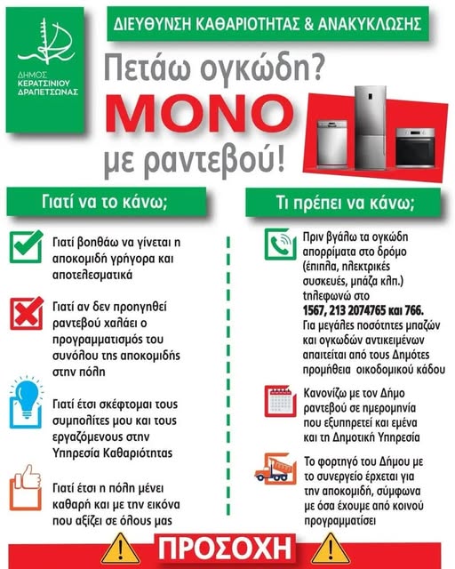Ο Δήμος Κερατσινίου Δραπετσώνας, ενημερώνει τους δημότες ότι η αποκομιδή ογκωδών απορριμμάτων (όπως έπιπλα, στρώματα, ηλεκτρικές συσκευές, μεγάλα αντικείμενα κ.λπ.) θα πραγματοποιείται αποκλειστικά και μόνο κατόπιν ραντεβού με την Υπηρεσία Καθαριότητας.