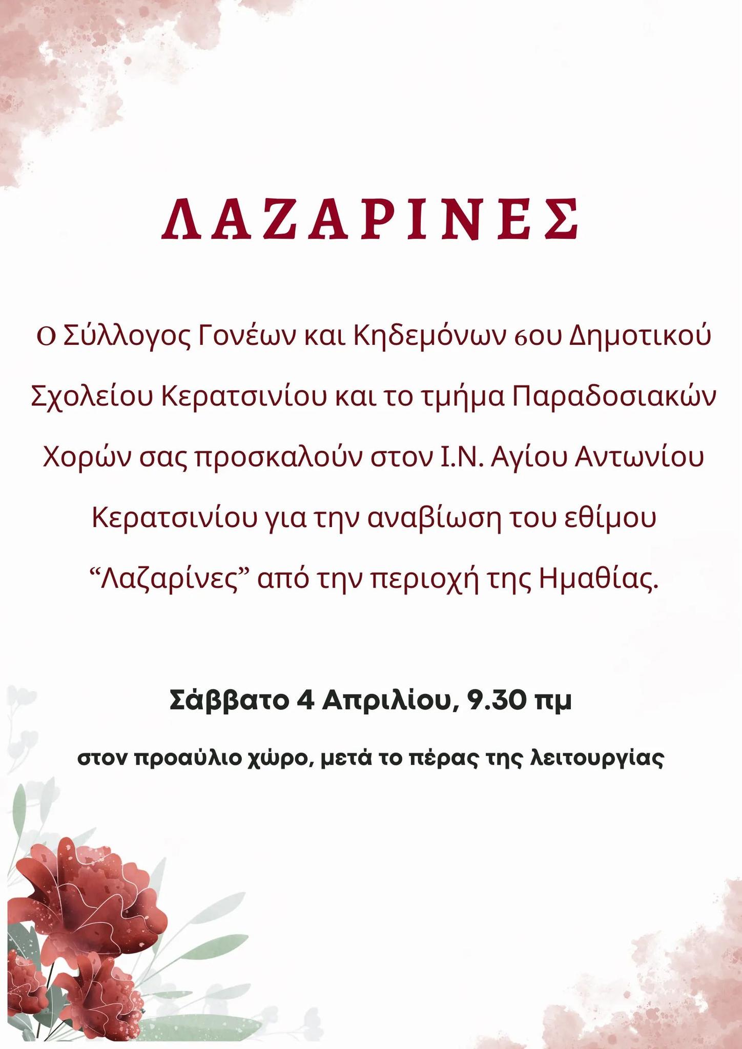 Το Σάββατο 4 Απριλίου, μετά το πέρας της Λειτουργίας θα ακούσουμε τα κάλαντα του Λαζάρου και άλλα παραδοσιακά τραγούδια από τα πιο μικρά κορίτσια μέχρι και τις έφηβες που συμμετέχουν στα τμήματα παραδοσιακών χορών του Συλλόγου.