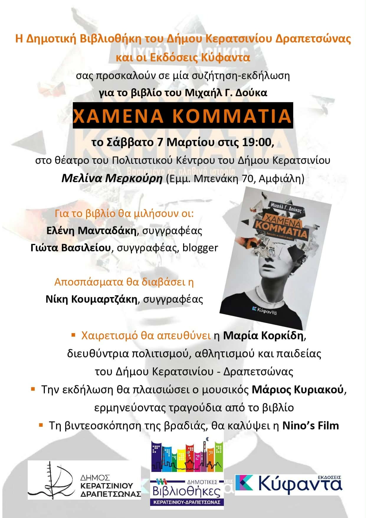 ΠΑΡΟΥΣΙΑΣΗ ΤΟΥ ΒΙΒΛΙΟΥ “ΧΑΜΕΝΑ ΚΟΜΜΑΤΙΑ” ΤΟΥ ΜΙΧΑΗΛ ΔΟΥΚΑ, ΑΠΟ ΤΗ ΔΗΜΟΤΙΚΗ ΒΙΒΛΙΟΘΗΚΗ ΚΕΡΑΤΣΙΝΙΟΥ-ΔΡΑΠΕΤΣΩΝΑΣ