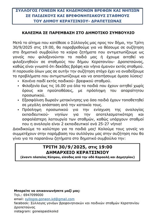 Μετά το αίτημα που κατέθεσε ο Σύλλογός μας προς τον δήμο, την Τρίτη 30/9/2025 στις 19:00, θα παραβρεθούμε για να θέσουμε σε συζήτηση στο δημοτικό συμβούλιο τα καίρια ζητήματα που αντιμετωπίζουμε ως γονείς που φιλοξενούνται τα παιδιά μας ή έχουμε αιτηθεί να φιλοξενηθούν σε σταθμούς του δήμου Κερατσινίου- Δραπετσώνας, καθώς είναι γνωστό ότι δεκάδες βρέφη και νήπια έμειναν εκτός σταθμού.